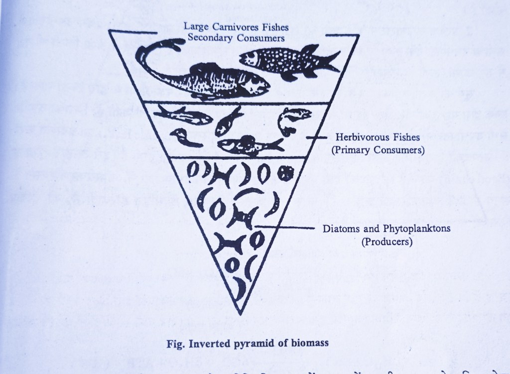 2. जलीय पारिस्थितिक तन्त्र में जीवभार पिरामिड उल्टा बनेगा, क्योंकि इसमें पादप प्लवक व जलीय पौधे उत्पादक हैं, जिनका जीवभार सबसे कम होता है, जबकि उपभोक्ताओं का जीवभार प्राथमिक से सदैव उपभोक्ताओं (मछलियाँ) तक बढ़ता जाता है।