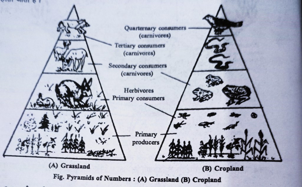 जैसे – 1. घास के मैदान तथा वन के पारिस्थितिक तन्त्र में उत्पादकों का जीवभार सबसे अधिक होता है, जबकि उपभोक्ताओं का जीवभार प्राथमिक, द्वितीयक तथा उच्च वर्ग में क्रमशः कम होता जाता है। अतः इसका पिरामिड सीधा बनेगा।